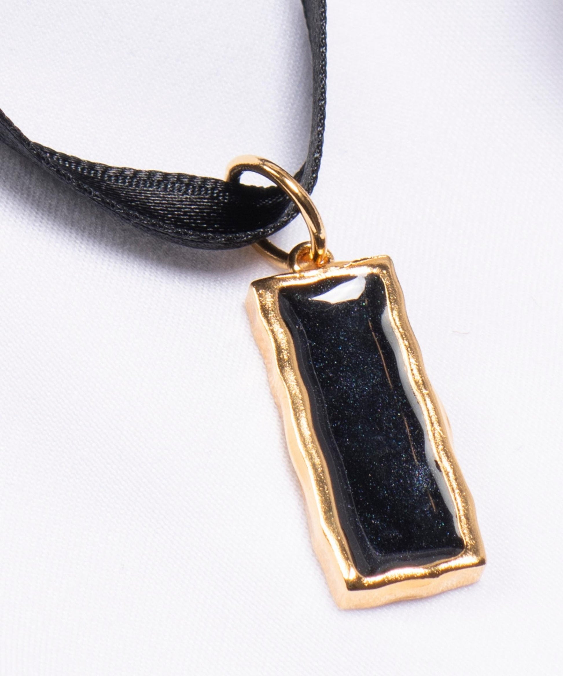 La Collana Raso e Ciondolo Amal Noire è realizzata con un nastro in doppio raso 100% Made in Italy di alta qualità e arricchita da un ciondolo smaltato a mano.
