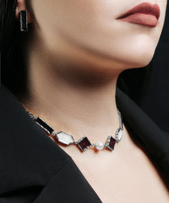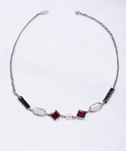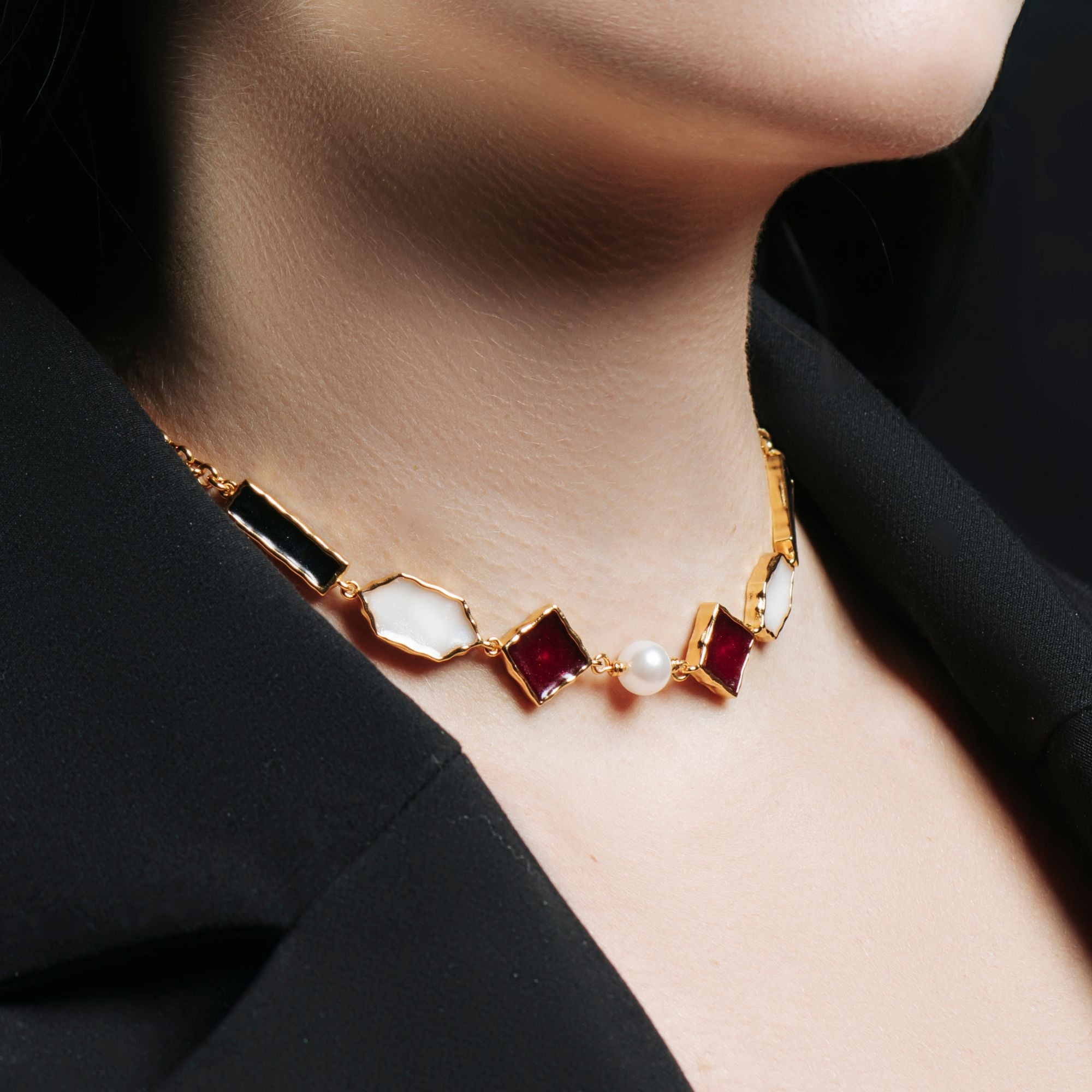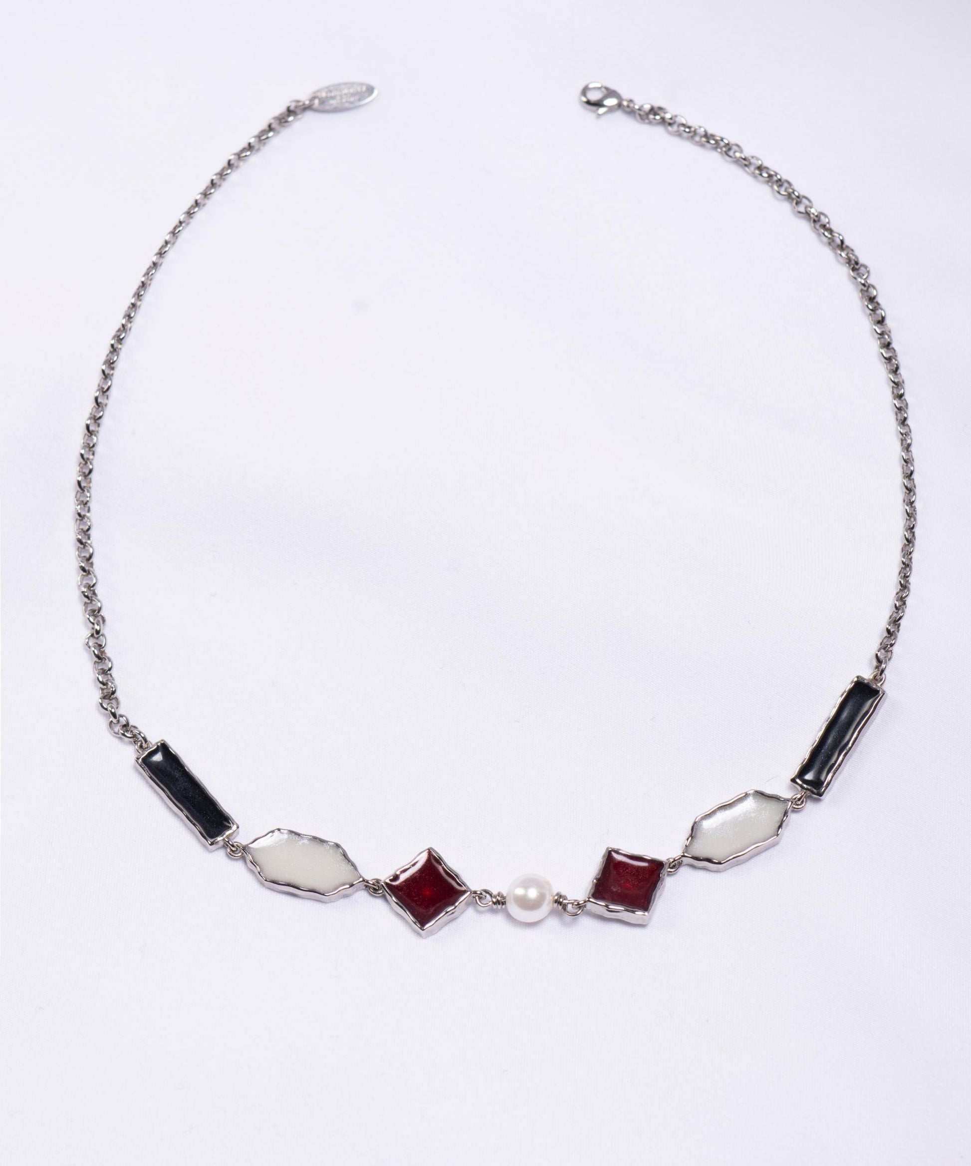 La collana Amal è formata da 6 elementi geometrici, ondulati e smaltati a mano, impreziositi da una perla di vetro centrale.