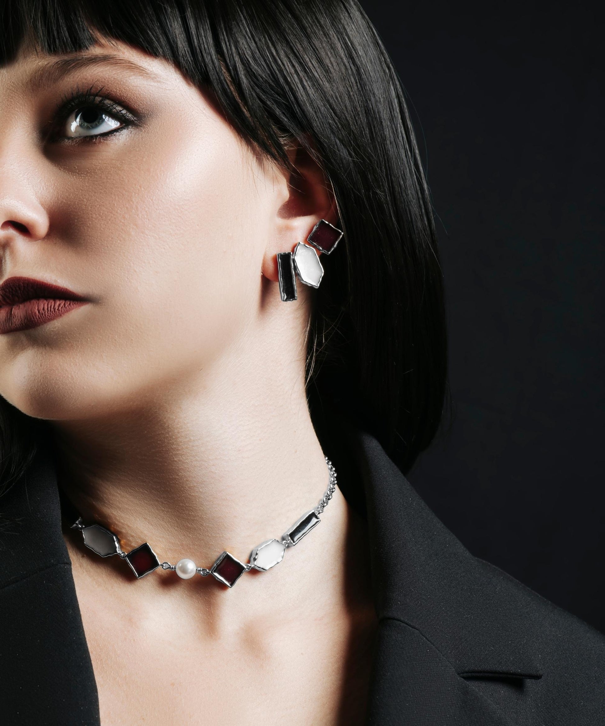 Una collezione che conserva l’anima della sua origine – la collezione Amal, ma si veste ora di una nuova profondità. Questa linea unisce elementi smaltati a mano, superfici riflettenti, perle di vetro e raso colorato in un gioco di contrasti e composizioni.
